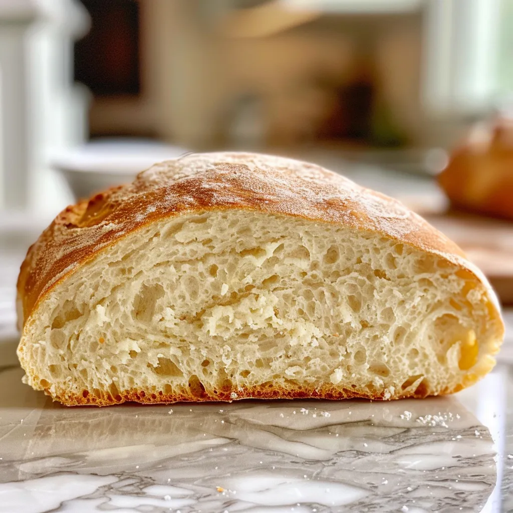 Sliced side view of freshly baked beginner bread, revealing a fluffy interior.