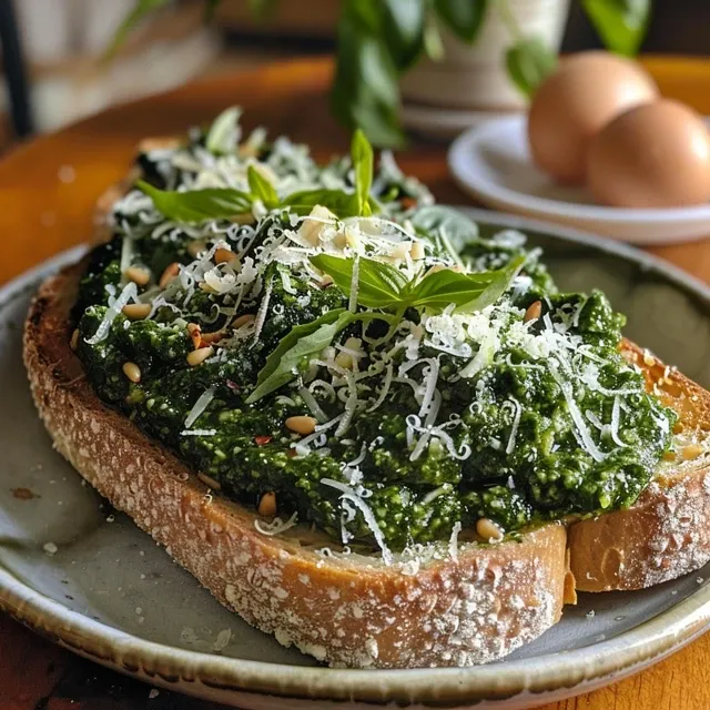 - Spread a generous layer of spinach pesto over each toasted slice. Halve the soft-boiled eggs and arrange them atop the pesto. Finish with flaky sea salt, freshly ground black pepper, and optional chili flakes or microgreens.